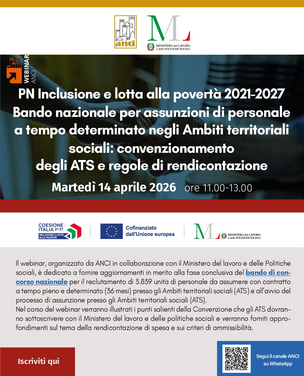 In vista dell’avvio del processo di assunzione presso gli Ambiti territoriali sociali (ATS), proseguono gli appuntamenti informativi, organizzati da ANCI in collaborazione con il Ministero del lavoro e delle Politiche sociali sui temi del welfare, con il webinar in programma il prossimo 14 aprile alle ore 11.00, dedicato al bando di concorso nazionale per il reclutamento di 3.839 unità di personale da assumere con contratto a tempo pieno e determinato (36 mesi) presso gli Ambiti territoriali sociali (ATS).